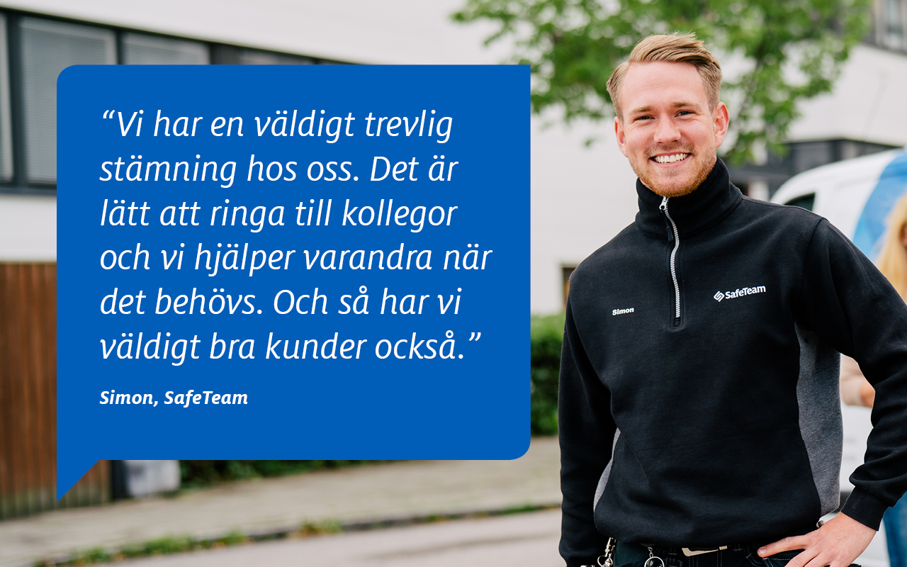 SafeTeam är stort nog för att erbjuda utvecklingsmöjligheter, stabilitet, kollektivavtal och fördelaktiga villkor – men samtidigt litet nog för en alldeles speciell och familjär stämning. Vi jobbar med ett brett produktutbud, allt ifrån passersystem, lås och larm till kameraövervakning, dörrautomatik, inbrottsskydd och brandskydd. Här hamnar du i gott sällskap, vi är cirka 200 härliga kollegor i Stockholm, Göteborg, Malmö, Linköping, Mölndal, Trollhättan och Stenungsund.